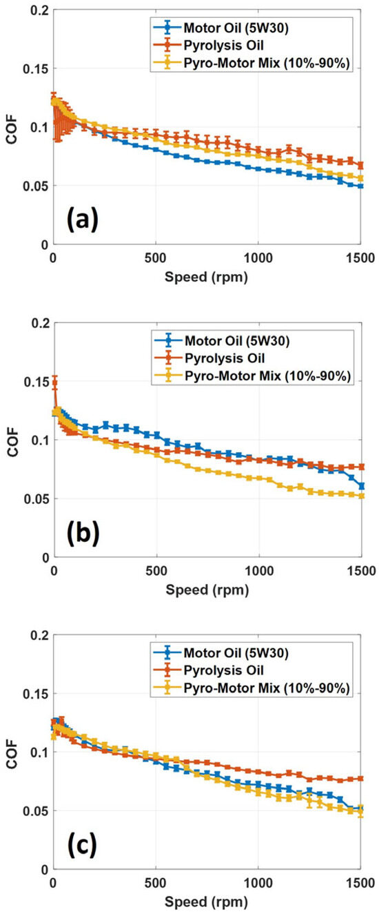 Variation in COF with speed for motor oil, pyro-oil, and the 10–90% oil mixture under operating temperatures of (a) 25 °C, (b) 50 °C, and (c) 75 °C.