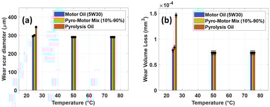 (a) Diameter of wear scar and (b) volume of wear loss of ball specimen after tribotesting using motor oil, 10–90% oil mixture, and pyro-oil samples under multiple operating temperatures.