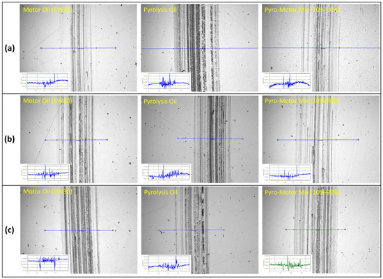 Images of wear scar of disk specimen after tribotesting using motor oil, pyro-oil, and 10–90% oil mixture samples under operating temperatures of (a) 25 °C, (b) 50 °C, (c) 75 °C. Inset: line profile across the wear scar.