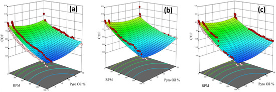 Figure 13 shows 3D surface figures generated using the obtained model that relates the COF with rotational speed and percentage of pyro-oil for different operating temperatures. It should be noted that the tribotests data in Figure 13 are presented as red and pink circles above and below, respectively, the 3D surface that represents the model-predicted COF values. In all examined operating temperatures, the COF increases with the increase in the percentage of pyro-oil and decreases as the speed increases. Moreover, as the percentage of pyro-oil increases from 0%, the COF starts to decrease up to around 10%; then, it starts to increase again, reaching maximum values at 100% pyro-oil (see Figure 13).