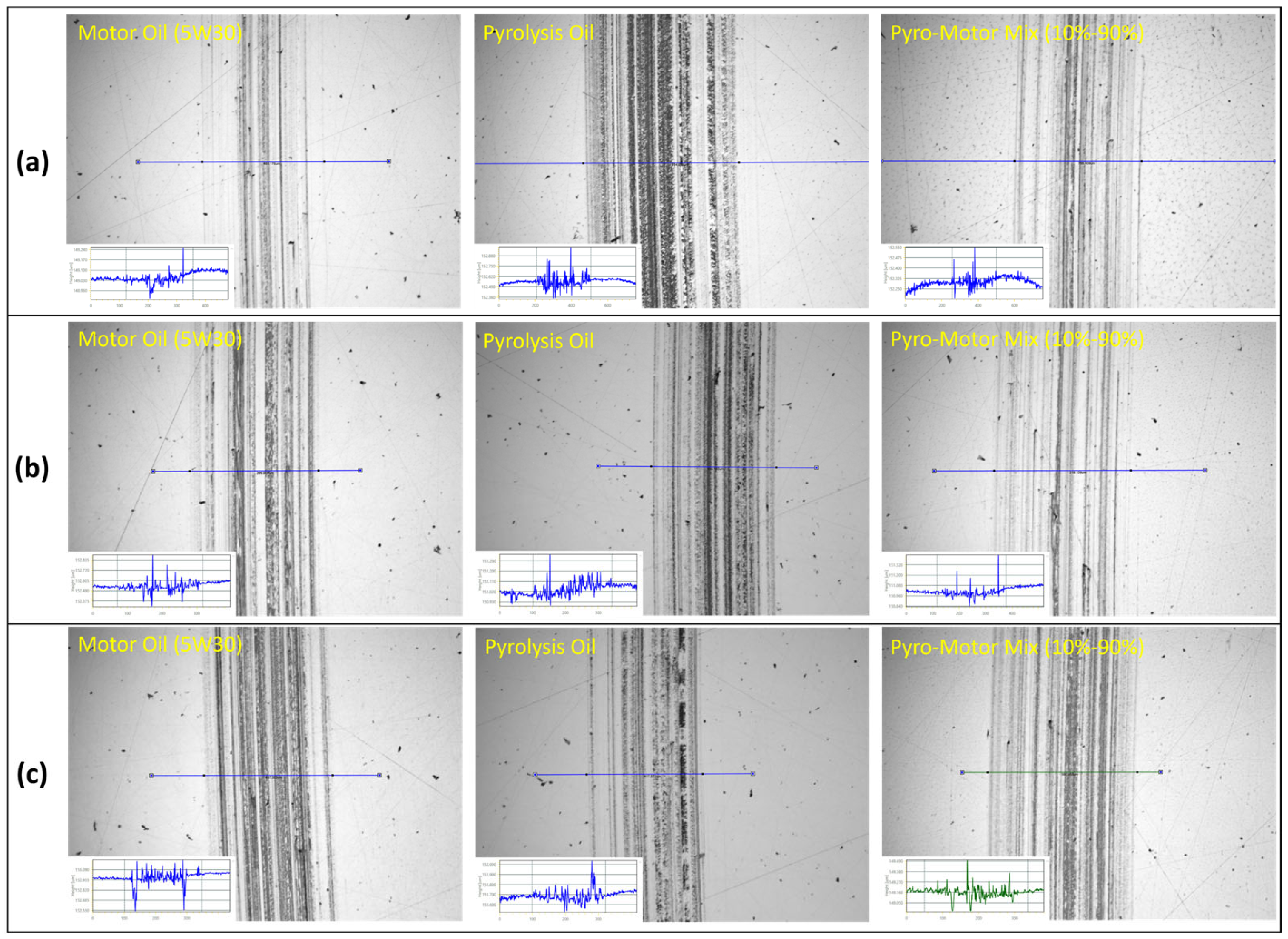 Figure 12 depicts wear scars images on the disk specimen after tribotesting using motor oil, pyro-oil, and 10–90% oil mixture samples at different temperatures. For the case of the 25 °C operating temperature, the disk wear scar for the pyro-oil is clearly wider and rougher in comparison to the motor oil and the 10–90% oil mixture (see Figure 12a). Conversely, for 50 °C and 75 °C operating temperatures, wear scars on the disk specimen were almost the same for all oil samples. An additional study was performed for disk wear scars by examining a surface line-height across each disk wear scar. The obtained results clearly indicate that the disk wear scars were very shallow, having a depth of lower than 100 nm for all examined oil samples and all operating temperatures. In brief, the obtained frictional and wear findings clearly indicate that adding a small concentration of pyro-oil (less than or equal to 10%) will not affect the lubrication functioning of existing motor oils.