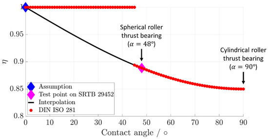 Based on this analysis, ISO/TR 1281-1 does not preconize any lifetime reduction in the contact angle range [0–45°] for thrust roller bearings. Only spherical roller thrust bearings with contact angle , cylindrical roller thrust bearings with contact angle , and all thrust roller bearings between these contact angles are concerned by this reduction, as shown in Figure 2.