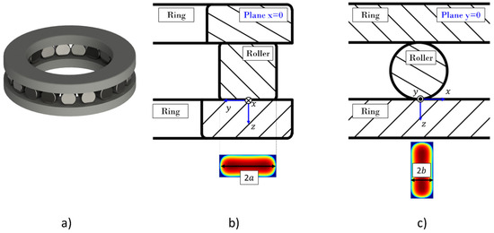 A single contact of a CRTB, represented in Figure 4a, is considered for the simulation. A 3D orthogonal Cartesian coordinate system (x,y,z) is introduced for a contacting body. The plane z = 0 mm coincides with the plane of contact, the x axis denotes the rolling direction (RD) axis of the rolling element, and the y axis is parallel to the roller axis and represents the contact width direction (CWD). z is the depth direction (DD), and it points from the contact surface to the interior of the body, as represented in Figure 4b,c.