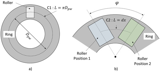 Considering that a roller must achieve an entire rotation ( around the axis normal to the contact surface while rolling a distance of (see Figure 6a), the roller is rotated about when rolling a distance (see Figure 6b), which is the distance between the steps used in the rolling contact analysis. In the simulation process, a steady-state solution is achieved when the roller rolls over a distance equal to 6 times the length of the contact surface in the x direction, i.e., . To compare the spinning motion between different configurations at the contact scale, a rate of rotation can be estimated, i.e., the amount of rotation for 1 mm of over-roll. This rate can be defined using Equation (13).