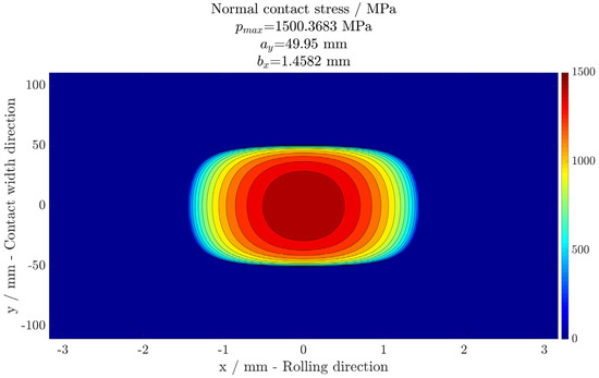 The 2D discrete normal contact stress is calculated using a semi-analytical model taken from [11]. In this model, the real contacting surface geometries are considered, including the roller profile but without roughness. The used roller profile comes from ISO/TS 16281 [12]. Contacting bodies are assumed to be isotropic, homogeneous, and elastic. The contacting bodies are brought into contact with all degrees of freedom blocked except for the movement along the z axis. Once the solids are in contact, the normal contact force is increased until the targeted largest normal contact stress in the contact surface is reached.