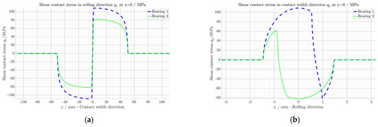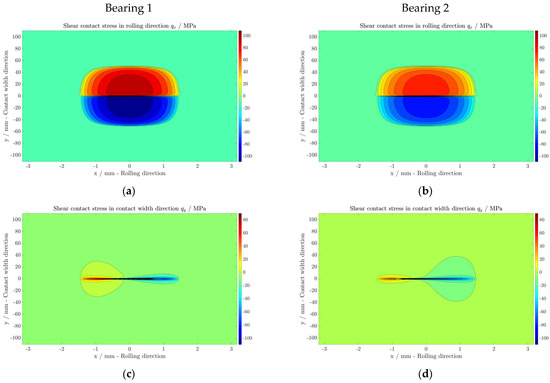 The 2D discrete shear contact stresses in the rolling direction and in the contact width direction are computed with the displacement-driven algorithm described in [11,13]. The spinning effect is modeled by a rotation of the roller around the axis normal to the contact surface. To consider the rolling contact, this calculation is made dynamic by translating one discretized body relative to the other according to the kinematics of STEP 2, as in [14]. This translation process is an iterative procedure where the points of the discretized stick and slip zone of the contact surface are actualized between each iteration loop, leading to a steady-state solution [15]. This dynamic calculation was validated with benchmark calculations available in the literature [16,17,18].