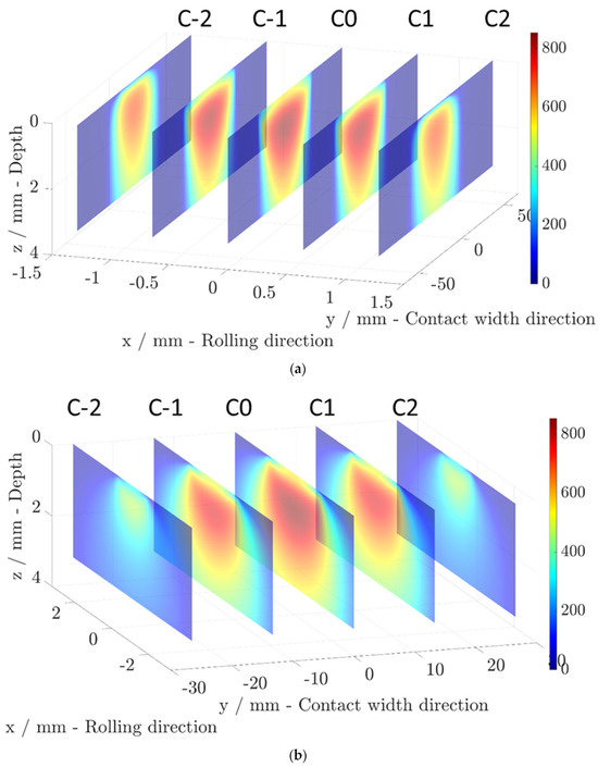From the discrete normal stress and the discrete tangential shear stresses and , the 3D elastic discrete subsurface stress tensors and are computed using a semi-analytical model based on [31,32]. m and n stand for the different components of the stress tensor, and stand for the discrete 3D space location. The 3D computational domain V and grid size are described in Table 2, where and denote the semi-axis of the contact surface in the contact width and rolling directions, respectively (see Figure 4b,c). The first dimension is the rolling direction (RD), the second is the contact width direction (CWD), and the third is the depth direction (DD).