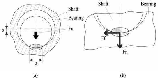 In most cases, the stresses to which the shaft-type parts are subjected lead to the emergence of forces that contribute to pressing the shaft spindles into the bearings intended to support the shafts. Due to these forces and, respectively, the weight of the shaft and the parts placed on the shaft, a displacement of the spindles occurs along a radial direction, which causes the axis of symmetry of the circular surface corresponding to the spindles to no longer coincide with the axis of symmetry of the circular surface in the sliding bearing and an eccentricity e to appear (Figure 1a). In the two components of the cylindrical joint, it can be observed that there are areas subjected to more intense mechanical pressing stresses. If theoretically the contact between the spindle and the bearing is made along a common generatrix of the two cylindrical surfaces of the joint, in practice, due to the elastic deformation of the superficial layers of the two components of the cylindrical joint, a contact surface with a width b is reached, which is determined by the magnitude of the mechanical stress generated by a normal force Fn resulting from the combination of the weight of the shaft and the components located on it with the forces generated by the shaft operation process.