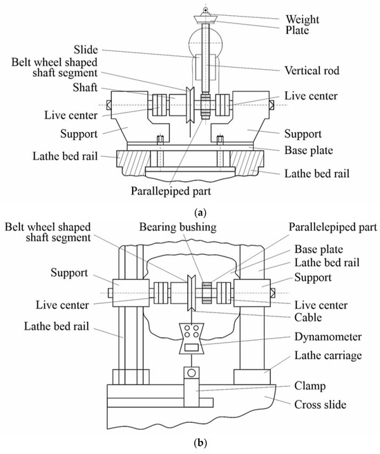 Device adaptable to a universal lathe and intended for measuring the friction force in the case of a cylindrical joint: (a) side view; (b) top view.