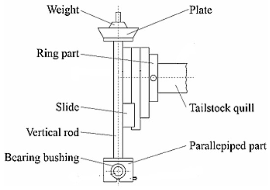 To carry out the experimental tests, the use of a device adaptable to a universal lathe was considered (Figure 3 and Figure 4). The device implies the existence of a base plate, by which the device can be placed and immobilized in a certain position on the guides of the universal lathe bed. The device used aimed to simulate the operating conditions of a cylindrical joint of the spindle-bearing bushing type.