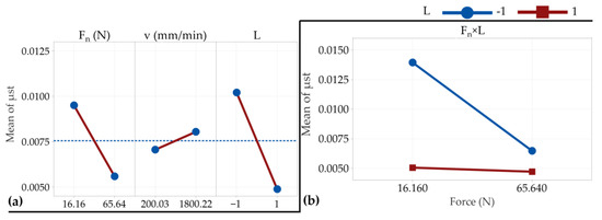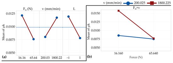 Addressing the problem of the kinetic friction coefficient µk, the factorial plots shown in Figure 7 highlight that the normal force Fn is the most significant variable, which is followed by the lubrication L and the travel speed v. All three variables correspond to the same path of evolution discussed for the µs. However, for µk, the variables have even more influence over the value of the kinetic friction coefficient µk. Regarding the variable’s interactions, it was observed that the combined effect of force Fn and travel speed v significantly influenced the value of the kinetic friction coefficient µk. The interaction plot illustrated in Figure 7b indicates that a higher force Fn, regardless of the travel speed v, is preferable for obtaining lower values of the kinetic friction coefficient µk.