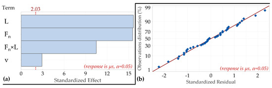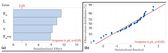 The regression analyses were conducted for a risk factor α = 0.05. As the analyzed variables have different natures (i.e., normal force Fn, travel speed v), the continuous variables were standardized by subtracting the mean and dividing it by the standard deviation. This way the analyzed continuous variables are comparable in effect and magnitude. The Pareto charts of the standardized effects displayed in Figure 8a (for µs) and Figure 8a (for µk) complete the image of the variable influence and interaction significance.