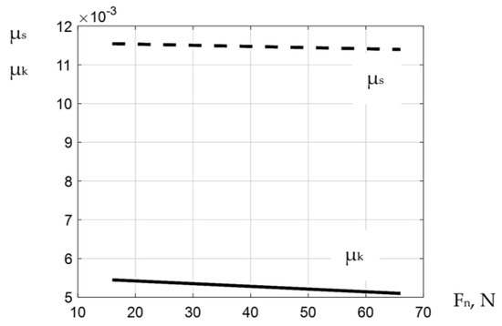 According to the graphic representation in Figure 11, it is found that with the increase in the magnitude of the normal force Fn, there is a slight decrease in the values of the static and kinetic friction coefficients. This result could be related to the so-called Rehbinder effect. In principle, the Rehbinder effect refers to the decrease in the hardness and ductility of some metallic materials, including those due to the presence of a surfactant film. The use of grease in the cylindrical joint could thus lead to a reduction in the magnitude of the friction force, as is the case with the use of other categories of lubricants [13,14].