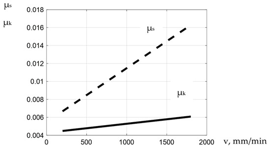 The influence of the speed v over the static friction coefficient μs and the kinetic friction coefficient µk values (normal force Fn = 40 N, L = +1, lubricant: grease type: MOL Liton LTA3EP).