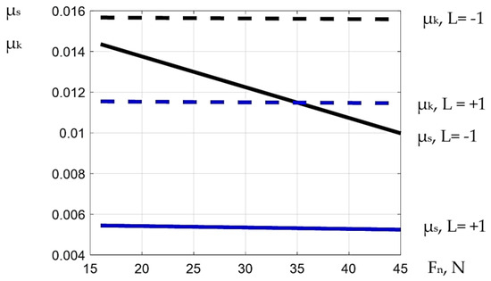 The influence of the presence of lubricant on the values of the static friction coefficient µs and the kinetic friction coefficient µk for different values of the normal force Fn (speed v = 1000 mm/min, L = −1, represented by black lines, and L = + 1, represented by blue lines, lubricant: grease type: MOL Liton LTA3EP).