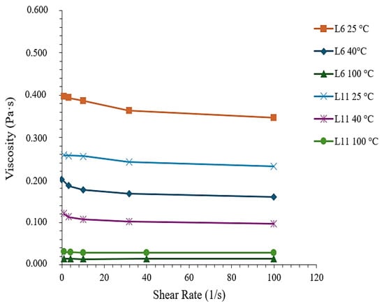 Apparent viscosity–shear rate curves for L6 (wet) and L11 (dry) at 25, 40, and 100 °C.