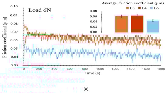 Variations in the coefficient of friction during ambient conditions of the test with various loads: (a) 6 N, (b) 15 N, and (c) 20 N, for commercial lubricants (L3–L4) and alternative natural lubricant L6 during 1800 s.