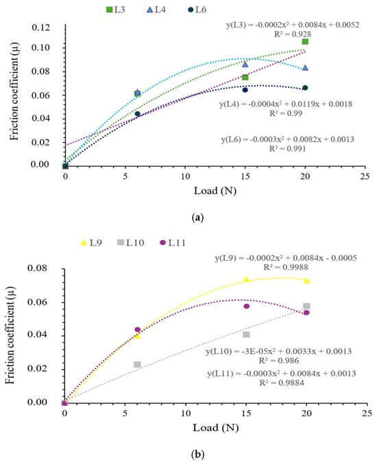 Correlation between coefficient of friction and applied load: (a) lubricants in wet conditions (L3, L4, and L6) and (b) lubricants in dry conditions (L9, L10, and L11).