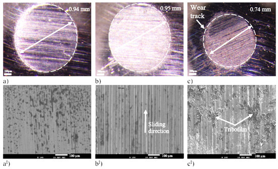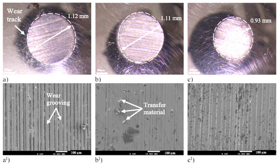 The wear rate and radius of the worn surface for L9 are 6.21 × 10−5 cm3/Nm and 1.12 mm, respectively, while for L10, the wear rate and radius of the worn track are 5.96 cm3/Nm and 1.11 mm (Figure 8a,b). In the case of L11, the wear rate is 2.95 × 10−5 cm3/Nm, and the radius of the worn surface is 0.93 mm (Figure 8c).