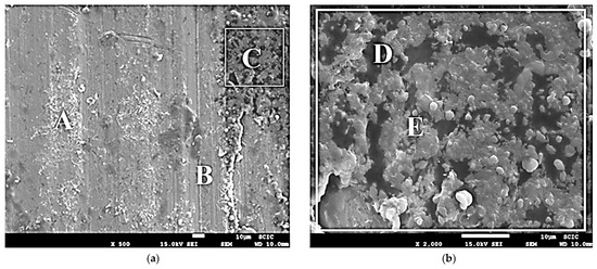 In Figure 9a, the presence of a tribofilm from the plant-based lubricant (L6) can be observed at point C on the damaged contact surface of the ball. Figure 9b provides a detailed view of the tribofilm morphology, where points D and E were analyzed using the EDX technique. This analysis identified the presence of the following elements: O, C, Fe, and Al.