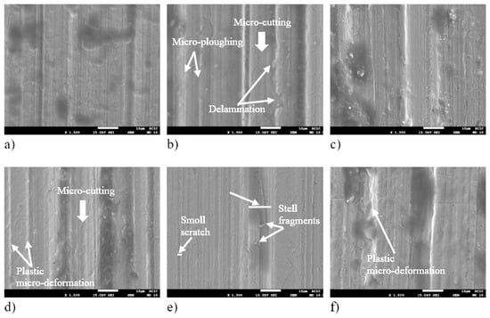 These Al2O3 particles can induce abrasive wear mechanisms such as micro-sandblasting and micro-cutting. The penetration of a sliding abrasive particle into a metallic surface results in micro-sandblasting or micro-cutting, depending on the angle of attack [25]. Sliding hard particles on softer metallic materials primarily causes elastic-plastic deformations as a function of the angle of attack. These deformations occur around the particles and ahead of their motion. In both scenarios, no material is removed from the friction surfaces; however, particles with higher angles of attack can shift the wear mechanism from micro-sanding to micro-cutting [26].