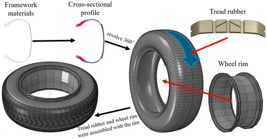 The tire model developed in this study was based on the Michelin ENERGY XM2+ (185/65R14), which is commonly used in passenger vehicles produced by Toyota, Honda, and Volkswagen. This radial tire consists of multiple materials and structural components. As a result, finite element modeling of the tire required the segmentation of different regions for independent meshing. This approach ensured that the constructed tire model exhibited physical properties identical to those of the real tire. Under vehicle weight load and hydrodynamic pressure during hydroplaning, the model reproduced deformation patterns consistent with the actual tire, serving as a prerequisite for ensuring the accuracy of hydroplaning simulations [25,26]. During the modeling process, the 2D cross-sectional profile of the tire was drawn in AutoCAD 2022 based on the actual dimensions of the tire model. Structural components such as the nylon overlay, belt, carcass ply, and inner liner, which served as the tire’s framework materials, were represented using lines. These lines were then imported into the meshing software HyperMesh 2019, where one-dimensional linear elements were used to model them. Independent surfaces corresponding to the sidewall, apex strip, rim cushion, bead wire, and bead filler were created over the framework. The two-dimensional tire structure with the framework was revolved 360° to form a basic tire model. Given that actual tires typically feature complex tread patterns composed mainly of transverse and longitudinal grooves, the tread rubber was modeled separately. The completed tread model was arrayed around the tire’s surface to create a detailed finite element tire model with structural characteristics identical to the real tire. The rim structure was bonded to the outer side of the tire using surface contact. A friction coefficient of 1.0 was applied to prevent relative displacement, effectively simulating the fixation of the tire to the rim in real-world conditions. This ensured that the tire experienced constraints identical to those of a real tire during motion. The modeling process is illustrated in Figure 1. This model accurately reflects the deformation of the tire under various working conditions, ensuring the precision of subsequent numerical simulation analyses.