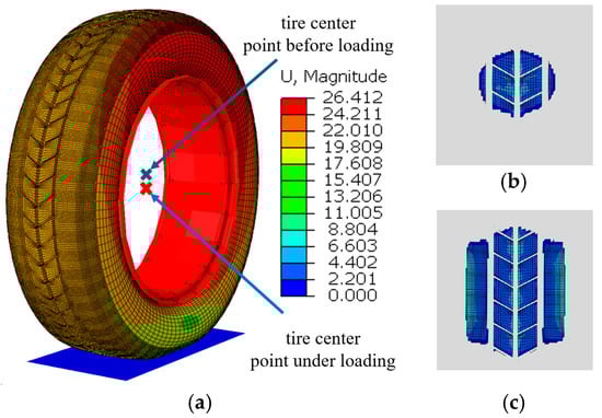 After assigning material parameters to the tire model, additional mechanical parameters were incorporated. To simulate the inflation pressure of a real tire, a uniformly distributed pressure of 0.24 MPa was applied to the inner surface of the tire. The road surface was modeled as a rigid flat plate with a friction coefficient of 0.8, which is consistent with the friction coefficient of an actual asphalt road. A vertical pressure of 3900 N is applied to the tire model to simulate the deformation caused by vehicle load (for a typical mid-size family car, such as a Honda Accord or Toyota Camry, weighing approximately 1400 kg to 1800 kg, we take an average value of 1600 kg; this weight is evenly distributed across four tires, resulting in each tire bearing a load of approximately 3900 N). The deformation contour of the tire under the combined effects of vehicle load, internal pressure, and ground support force is shown in Figure 2a. The blue cross represents the position of the tire’s center point before loading, while the red cross indicates its position after loading. It was observed that the center point of the tire moved downward under the applied load, with the tread region in contact with the ground flattening and the sidewall exhibiting bulging. This deformation occurred due to the redistribution of internal stress as the load was transmitted from the tire to the ground. Specifically, the contact area experienced compressive forces, while the sidewall region exhibited significant bulging caused by tensile forces. Figure 2b shows the tire’s contact area with the ground before loading, and Figure 2c illustrates the contact area after loading.