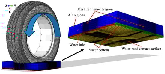 In previous studies, hydroplaning models were typically created by placing a rectangular component beneath the tire model and using Boolean operations to subtract overlapping regions, thereby extracting the fluid domain with the tire tread pattern [29,30]. The water inflow velocity at the inlet was set as equal in magnitude but opposite in direction to the vehicle’s speed. However, this method had a major limitation: it failed to allow fluid to enter the oblique grooves of the tire, resulting in an unrealistic representation of the hydroplaning process. This issue stemmed from the omission of the dynamic interaction between the rotating tire and the water surface. To overcome this limitation, a more advanced tire model was developed, incorporating both translational motion along the road surface and rotational motion around its central axis. By coupling the fluid domain with the tire and conducting fluid–structure interaction calculations, real-time interactions between the tire and the fluid were captured. This approach more accurately represented the iterative process between the tire’s deformation under load and the flow field variations within the fluid domain, providing a more realistic simulation of hydroplaning.