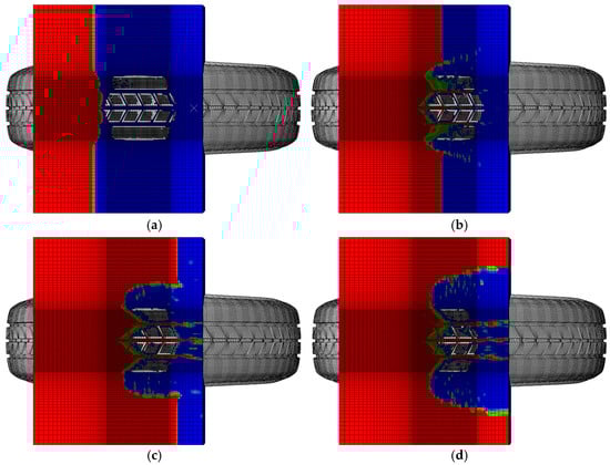 A simulation was conducted on a 185/65R14 tire under the conditions of an inflation pressure of 240 kPa and a fluid surface height of 7.684 mm, with the tire traveling at a speed of 70 km/h. As shown in the contour plots in Figure 3, at 7.00533 s of simulation time, the tire had just made initial contact with the water. At this stage, insufficient hydrodynamic pressure had developed, and the tire’s drainage performance was negligible. Consequently, the tire’s contact area with the ground was at its maximum, and the ground contact stress reached its peak, as shown in Figure 4a. At 7.00933 s, the tire was fully in contact with the water, and fluid had begun entering the tire grooves. During this phase, the hydrodynamic pressure started to increase gradually, as shown in Figure 4b. By 7.01333 s, the appearance of more red regions in the grooves indicated that the drainage performance of the tire grooves was becoming more evident. The grooves began to significantly influence the tire’s ability to displace water. The contact area with the ground further decreased, suggesting a reduction in the ground contact stress, as shown in Figure 4c. Compared to the conditions at 7.00533 s, the contact area between the tire and the ground had diminished, as shown in the contour plots. However, since the tire had not yet fully transitioned to a water-covered road, water displacement from the ground contact region was primarily achieved through the grooves and tire’s sides. At 7.02133 s, the tire was in full contact with the fluid, and the curvature of water displacement to both sides of the tire became significantly more pronounced, as shown in Figure 4d.