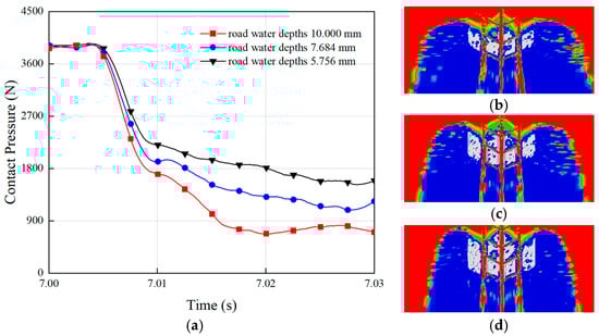 Effect of water depth on tire hydroplaning: (a) contact pressure during hydroplaning for tires at different water depths. The ground contact areas of (b) water = 10.000 mm; (c) water = 7.684 mm; (d) water = 5.756 mm.