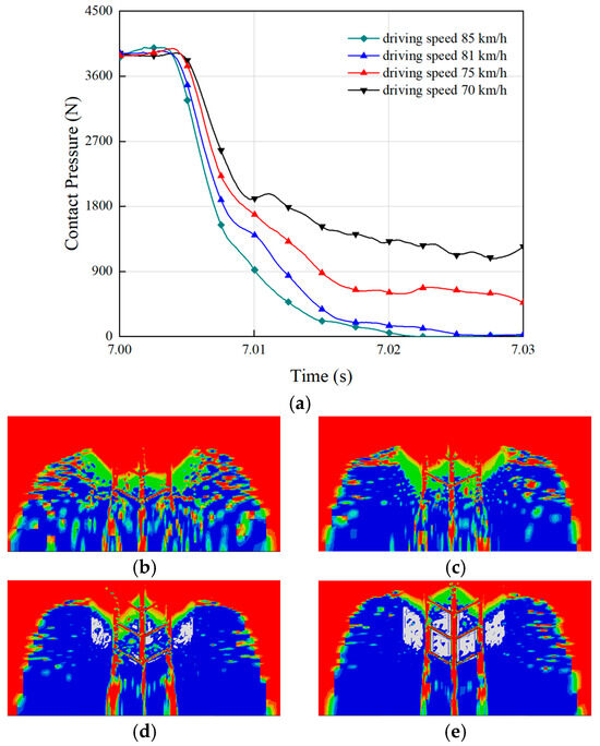 Effect of driving speed on tire hydroplaning: (a) the contact pressure with the ground during hydroplaning for tires at different driving speeds. The ground contact areas of (b) speed = 85 km/h; (c) speed = 81 km/h; (d) speed = 75 km/h; (e) speed = 70 km/h.