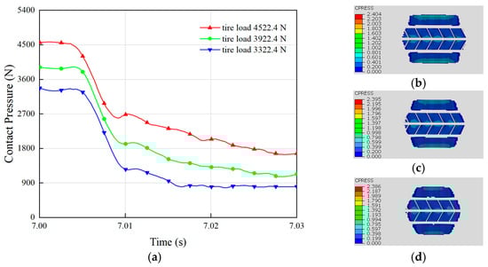 The tire load, referring to the vertical force exerted on the tire, represents the force transmitted from the vehicle to the ground through the tire. The tire load significantly influences hydroplaning performance, with the most evident effect being that an increase in tire load generally enhances the contact pressure between the tire and the ground, thereby improving grip [40]. A greater vertical load increases the contact area between the tire tread and the road surface, enabling better traction and thus enhancing hydroplaning resistance. Moderate tire loads can improve vehicle handling, as increased vertical loads contribute to vehicle stability and enhance cornering grip. The influence of the tire load on hydroplaning performance is primarily reflected in changes in the ground contact pressure. Variations in the tire contact pressure under different loads during hydroplaning are shown in Figure 7a. As illustrated, the initial contact pressure between the tire and the ground differs under varying loads. An increase in load improves the contact pressure between the tire and the ground during hydroplaning. For example, when the load increased from 2922.4 N to 3322.4 N, the tire’s contact force with the ground during hydroplaning rose by 200 N. Further increasing the load from 3322.4 N to 4522.4 N resulted in a contact force increase of 600 N. Hence, increasing tire load effectively mitigates hydroplaning, with larger weight increments producing more significant improvements in hydroplaning resistance. Comparing Figure 7b,d reveals that increasing the load also enlarges the tire–road contact area due to the deformation of the tire under stress. Overall, increasing tire load enhances the contact area and pressure between the tire and the ground, making it an effective strategy for improving hydroplaning resistance.