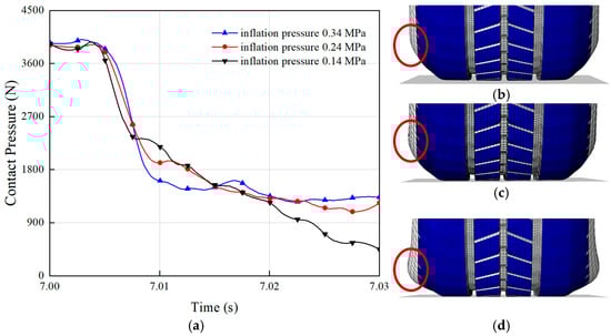 The inflation pressure of a tire significantly influences its hydroplaning performance by directly affecting the contact area between the tire and the ground [41]. A proper inflation pressure ensures uniform tread contact with the road surface, thereby enhancing grip. The effect of inflation pressure on hydroplaning performance is illustrated in Figure 8a. Analyzing the curves in the figure reveals that the contact pressure between the tire and the ground showed minimal variation when the inflation pressures were 0.24 MPa and 0.34 MPa. This is because at these inflation pressures, the deformation of the tire sidewall was relatively minor, as shown in Figure 8b,c, resulting in limited impact on the tire’s drainage performance. Consequently, with negligible changes in hydrodynamic pressure, the contact pressure remained the same. However, at an inflation pressure of 0.14 MPa, the tire sidewall exhibited significant deformation, reducing the distance between the tire center and the ground and narrowing the gap between the tire and the surface, as depicted in Figure 8d. By contrast, a tire with an inflation pressure of 0.34 MPa created a larger gap between the tire and the ground, which was more conducive to water evacuation along the sides of the tire. This reduced water accumulation between the tire and the ground decreases the hydrodynamic pressure and increases the contact pressure. Maintaining appropriate inflation pressure not only improves driving safety but also extends the tire lifespan. Drivers are advised to regularly check the tire inflation pressure and ensure that it remains within the manufacturer’s recommended range.