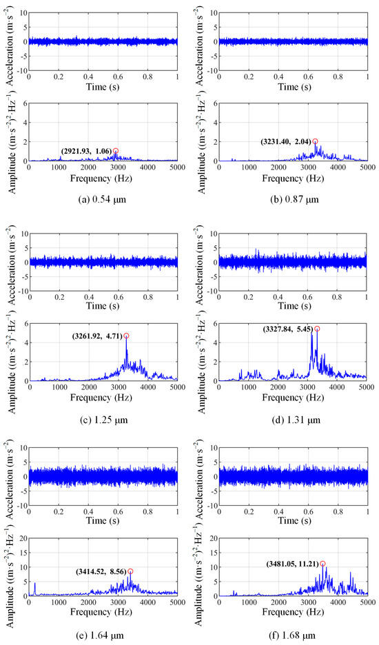 Time-domain and power spectral density analyses were performed on the vibration signals obtained from the above experiments, and the results are shown in Figure 12. The CRFs under different surface roughness and a constant load of 500 N range from 2921.93 Hz to 3811.88 Hz. Due to different surface roughness and lubricating oil film distribution, the actual loads borne by asperity contacts did not reach 500 N. Therefore, the experimental CRF values are smaller than the calculated CRF under a constant load of 500N. This also validates the validity of the dynamic model.