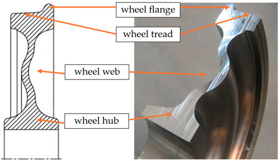The monoblock wheels’ monolithic nature simplifies their construction and production. The manufacturing process involves machining a monoblock to obtain the designed shape [1,5,6]. The wheel’s design comprises a flange and a tread that are in direct contact with rails, and a web (Figure 2).