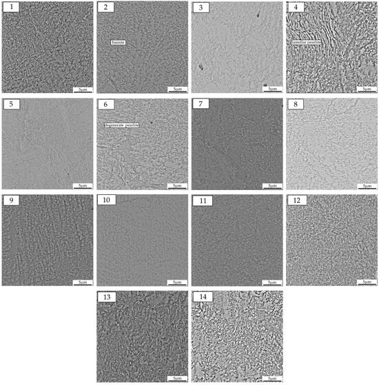 The microstructure of the parent material of the cast monoblock wheel tested, documented using a light microscope, is shown in Figure 6. The analyzed microstructure corresponds to a hypoeutectoid cast steel. A network of ferrite precipitates is visible along the grain boundaries of the former primary austenite. In some cases, some of the ferrite precipitations are similar to the Widmanstätten structure, indicating accelerated cooling in the temperature range of ferrite precipitation from austenite (Figure 6(1,6,12)). In certain cases (Figure 6(14)), the morphological characteristic of the matrix clearly suggests the presence of pearlitic structure. The characteristic lamellar arrangement of ferrite and cementite for the eutectoid in iron alloys is visible, but it was often difficult to observe lamellar patterns in most cases.