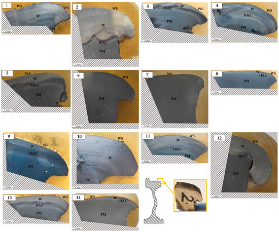 Macro image of etched metallographic sections with marked areas: W—weld, HAZ—heat-affected zone, PR—parent material, WS—working surface. (1–14): number of the wheel.