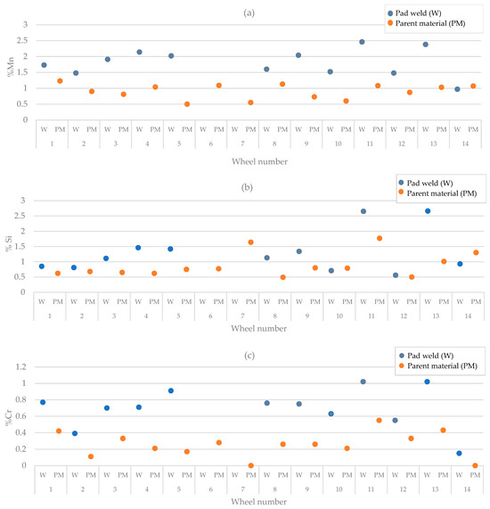 The chemical composition of the parent material of the undeformed areas of the wheel (i.e., the flange) was obtained using a spark spectrometer (Table 1). The results of this analysis determined that the monoblock wheels were made of hypoeutectoid unalloyed cast steel [29,30]. The chemical composition of samples taken from the wheel tread edge area was examined using an EDS (Energy Dispersive Spectroscopy) analysis in a scanning electron microscope, and the obtained results were presented in the Table 4 and the form of graphs (Figure 9) showing the contents of the given elements in the adopted padding weld and parent material. Analyzing Figure 9 reveals that, in most of the samples, the content of alloying elements in the adopted padding weld is higher than in the parent material. This finding suggests the possibility of the use of additional material during the welding process.