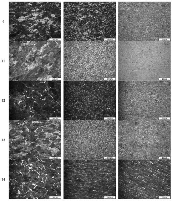 In the case of the materials tested, the microstructure of the material in the surface area is characterized by a distinct igneous morphology. The character of the microstructure of the surface varies for the different monoblock wheels tested. It is possible to observe samples characterized by a significantly larger needle size (Figure 10(4c)) and materials with a significantly finer microstructure (Figure 10(11c)). The observed differences are also significantly influenced by the plastic deformation of the material about its service life. This is particularly evident in the case of wheel 14 (Figure 10(14c)).