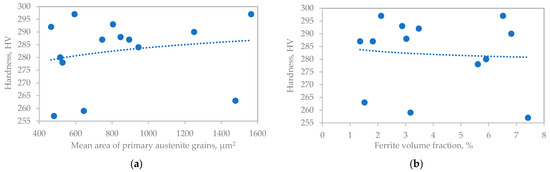 Figure 12a illustrates the relationship between the mean area of primary austenite grains and material hardness, whereas Figure 12b presents the correlation between hardness and ferrite volume fraction. The data indicate a tendency for hardness to increase with an increase in the mean cross-section area of primary austenite grains and to decrease with an increase in the ferrite volume fraction.