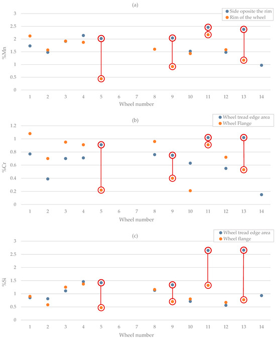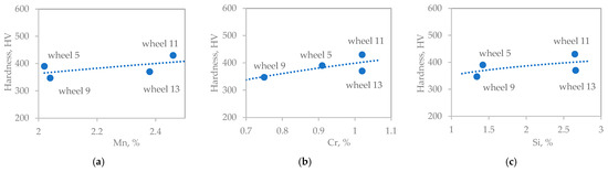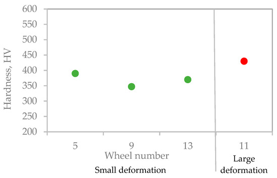 Macroscopic observations of samples taken from the wheel flange no. 1–5 and 8–13 are characterized by the so-called area modified as a result of post-casting processing (Figure 8). Most likely, these are places where casting defects were repaired by welding. To select regenerative weld (RW), the obtained contents of manganese, silicon, and chromium of samples taken from the wheel tread edge area were compared with the measurement values of samples taken from the flange (Figure 13). Preliminary analysis showed that samples taken from the treat edge area from wheels 1–4, 8, 10, and 12 most likely contain only foundry weld (W). Differences in chemical composition can be seen for samples from wheels 5–7, 9, 11, 13, and 14, which may indicate that the welding was carried out only after the wheels (RW) were worn out. These assumptions were confirmed by microstructural documentation for samples from wheels 5, 9, 11, and 13 (Figure 10). Wheels 6 and 7 were rejected based on previous macroscopic observations that indicated no welding was used (Figure 8). In the microstructural documentation for the sample from wheel nr 14, a microstructure characteristic of the parent material was observed (Figure 10). The low hardness also confirmed that the welding process was not applied to wheel 14, and thus, the analysis will be focused on samples from wheels 5, 9, 11, and 13.