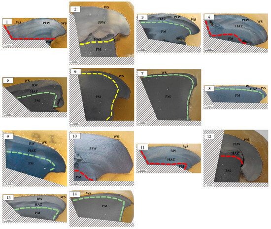 Macro image of etched metallographic sections with marked deformation degree (large deformation—red line, medium deformation—yellow line, small deformation—green line) and areas: repair weld (RW), post foundry weld (PFW), heat-affected zone (HAZ), parent material (PM), working surface (WS). (1–14): wheel number.