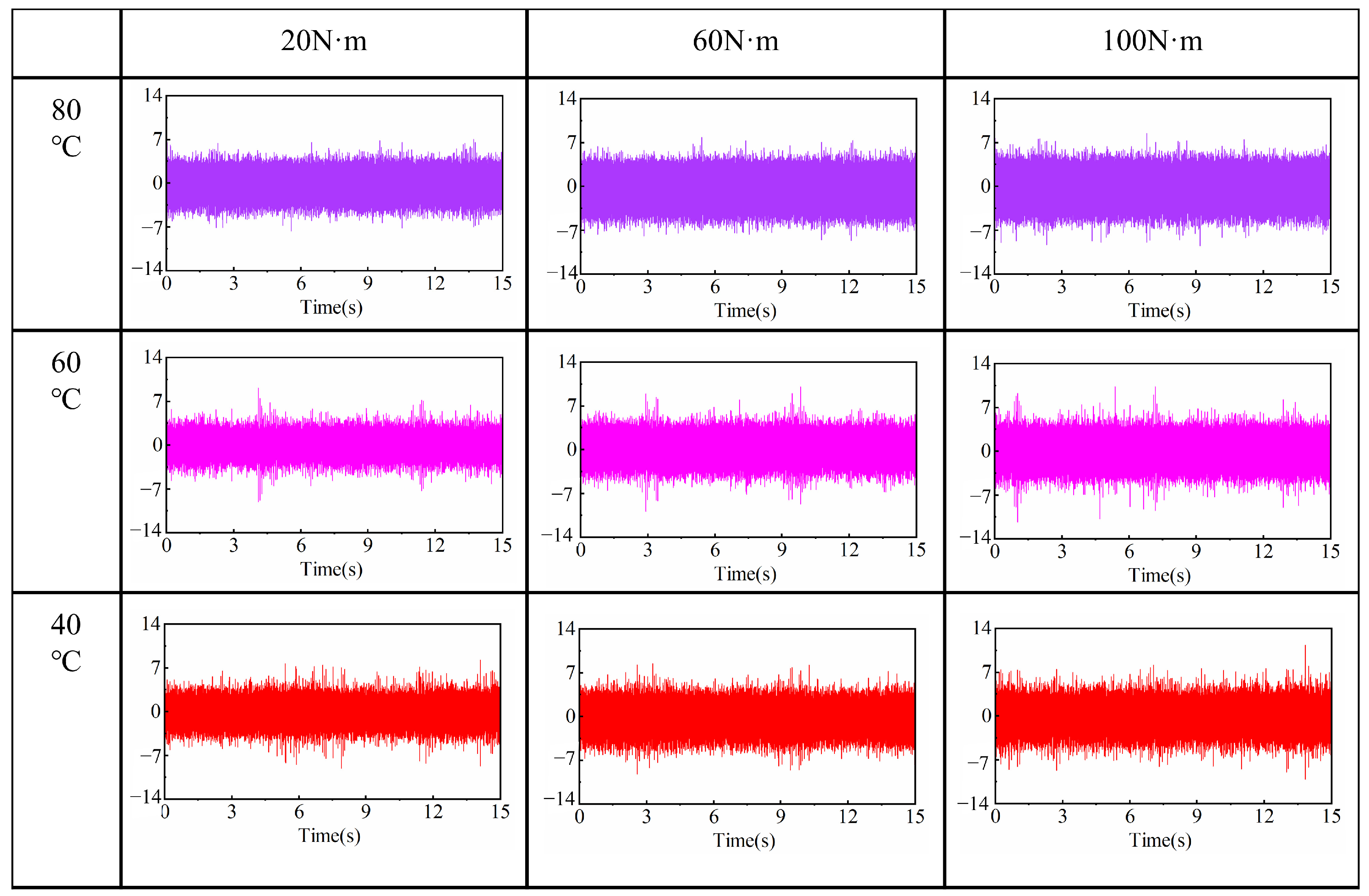 Additionally, a speed-torque sensor was deployed to measure transmission efficiency. The experiment was set at the different speeds (1200 r/min, 800 r/min and 400 r/min), torques (20 N·m, 60 N·m and 100 N·m), and oil temperatures (40 °C, 60 °C and 80 °C). A total of 27 test groups were conducted. Since this paper aims to determine the vibration behavior of the gearbox at different operating temperatures, vibration acceleration data under non-temperature conditions will not be analyzed in detail.