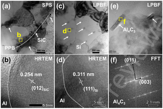 | 2020 | A355 | SiC, Graphite, Graphite nano-sheet (GNS) | 45 | Powder metallurgy | GNSs accelerated aluminum deformation, formed Al4C3 bridges, and uniformly dispersed, restraining grain growth to produce a 57.7 nm SiC-GNS/Al composite | [99] |