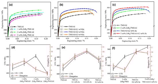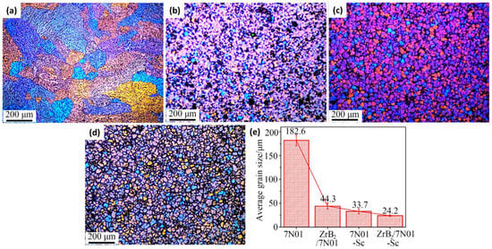 - Kai, X.; Wang, Y.; Chen, R.; Peng, Y.; Shi, A.; Tao, R.; Liang, X.; Li, G.; Chen, G.; Xu, X.; et al. Effects of In-Situ ZrB2 Nanoparticles and Scandium on Microstructure and Mechanical Property of 7N01 Aluminum Alloy. J. Rare Earths 2024, 42, 612–620. [Google Scholar] [CrossRef]