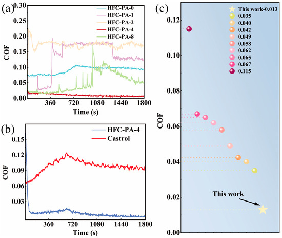 (a) Coefficient of friction curves of HFC-PA-0, HFC-PA-1, HFC-PA-2, HFC-PA-4, and HFC-PA-8 under a load of 392 N with a speed of 1200 r/min. (b) The friction coefficient curves of HFC-PA-4 and the internationally leading commercial hydraulic fluid Castrol under the conditions of 392 N and 1200 r/min, (c) Under the test conditions of 392 N and 1200 r/min, the comparison of friction coefficients of lubricants from different literature sources is as follows [31,32,33,34,35,36,37,38,39].