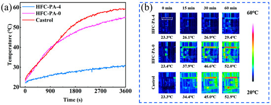 The experiment was conducted under conditions of a 392 N load and a rotational speed of 1200 revolutions per minute, (a) Temperature curves of lubricants (HFC-PA-4, HFC-PA-0, and Castrol), (b) Thermal images of equipment with HFC-PA-4, HFC-PA-0, and Castrol lubricants.