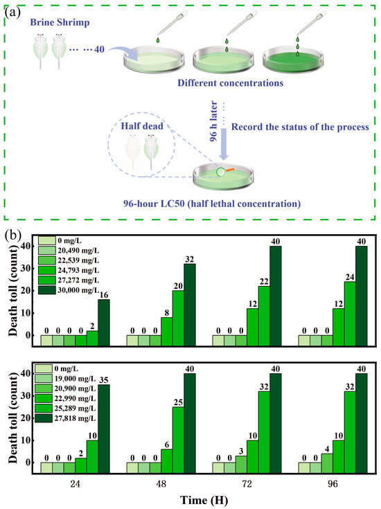 Validity of the experiment: At the end of the experiment, the mortality rate of the Brine Shrimp in the blank control group was 0%, the dissolved oxygen in the test solution ranged from 86.2% to 99.9%, the test temperature ranged from 24.9 °C to 25.6 °C, the salinity was between 30 ppt and 31 ppt, and the pH ranged from 7.78 to 8.15. These parameters met the quality control requirements for the test standards (the mortality rate of Brine Shrimp in the blank control group should not exceed 10%, the dissolved oxygen saturation of the test solution should be greater than 60%, the water temperature change during the test period should not exceed 2 °C, the salinity change should not exceed 2, and the pH change range should not exceed 0.4; therefore, the results of this experiment are valid.