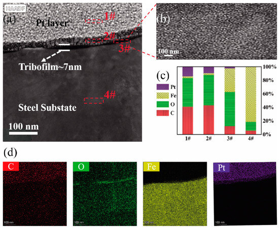 The detailed condition of the lubricating film formed after a 30 min friction test of GCr15 steel balls under the test conditions of 392 N and 1200 r/min were analyzed using HRTEM. As shown in Figure 4a, a section of the wear track on the GCr15 steel balls lubricated with HFC-PA-0 was extracted using FIB, revealing layers 1# and 2# as two different Pt layers on top, with layer 3# being the lubricating film and layer 4# representing the steel substrate. Figure 4b indicates that layer 3# does not exhibit lattice fringes. Figure 4c,d shows the corresponding element content displayed by EDS, indicating a lower Fe content in the lubricating film layer compared to the steel substrate, while the carbon and oxygen content is higher. These results indicate that after 30 min of friction testing, a lubricating film with a thickness of approximately 7 nm is formed on the surface of the GCr15 steel balls lubricated with HFC-PA-0.
