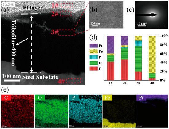 Similarly, as shown in Figure 5a, a section of the wear track on the GCr15 steel balls lubricated with HFC-PA-4 was extracted using FIB. The section revealed layers 1# and 2# as two different Pt layers on top, with layer 3# being the lubricating film and layer 4# representing the steel substrate. Figure 5b,c indicate that layer 3# exhibits no lattice fringes, indicating an amorphous structure. Figure 5d,e shows the corresponding element content displayed by EDS, indicating a lower Fe content in the lubricating film layer compared to the steel substrate, while the carbon and oxygen content is higher. Unlike the lubricating film produced by HFC-PA-0, the lubricating film produced by HFC-PA-4 contains a significant enrichment of P elements, and the thickness of the lubricating film increases from 7 nm without PA addition to 392 nm with 4% mass concentration of PA. This is because the addition of a 4% mass concentration of PA enhances the adsorption capacity of HFC-PA-4 to the GCr15 steel substrate.